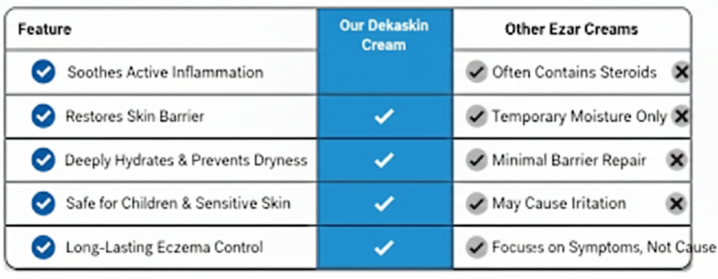 Dekaskin is: Steroid-free Side-effect free Suitable for long-term use Targets inflammation at its source Restores the skin barrier